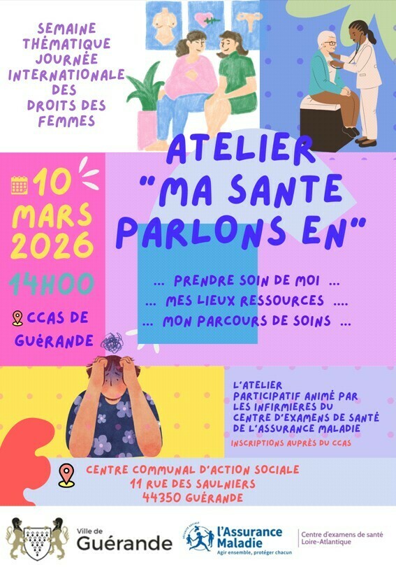 Atelier participatif « Ma santé, parlons-en » le 10 mars 2026 à 14h au CCAS de Guérande. Animé par les infirmières du centre d’examens de santé de l’Assurance Maladie.