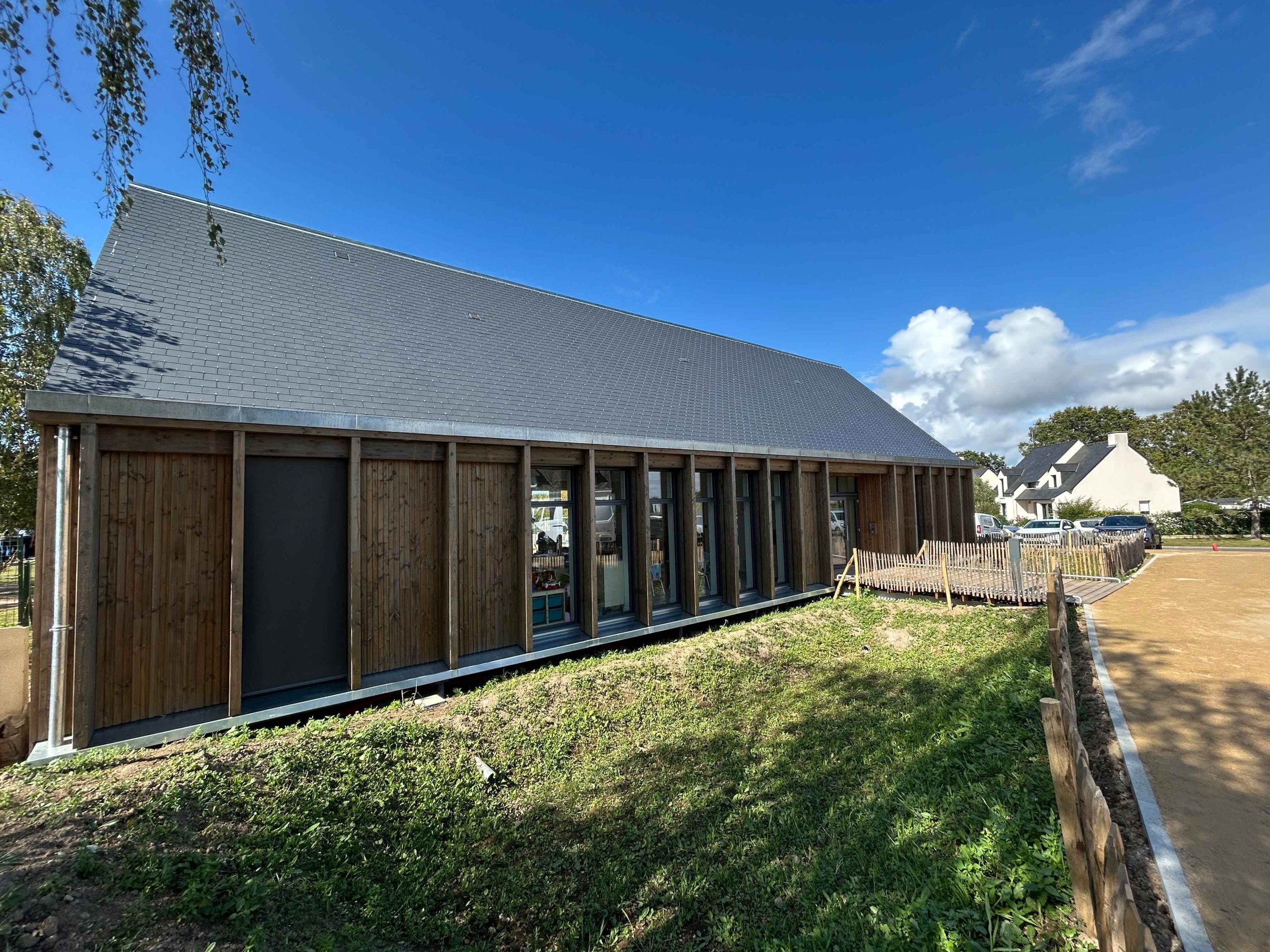 Le bâtiment, construit en bois et modulable, offre une surface totale de 185 m², dont 83 m² pour la grande salle destinée aux enfants. Une terrasse en bois relie directement l’accueil périscolaire aux cours de l’école maternelle et élémentaire, permettant une meilleure fluidité des circulations et facilitant le quotidien des enfants et des équipes éducatives.