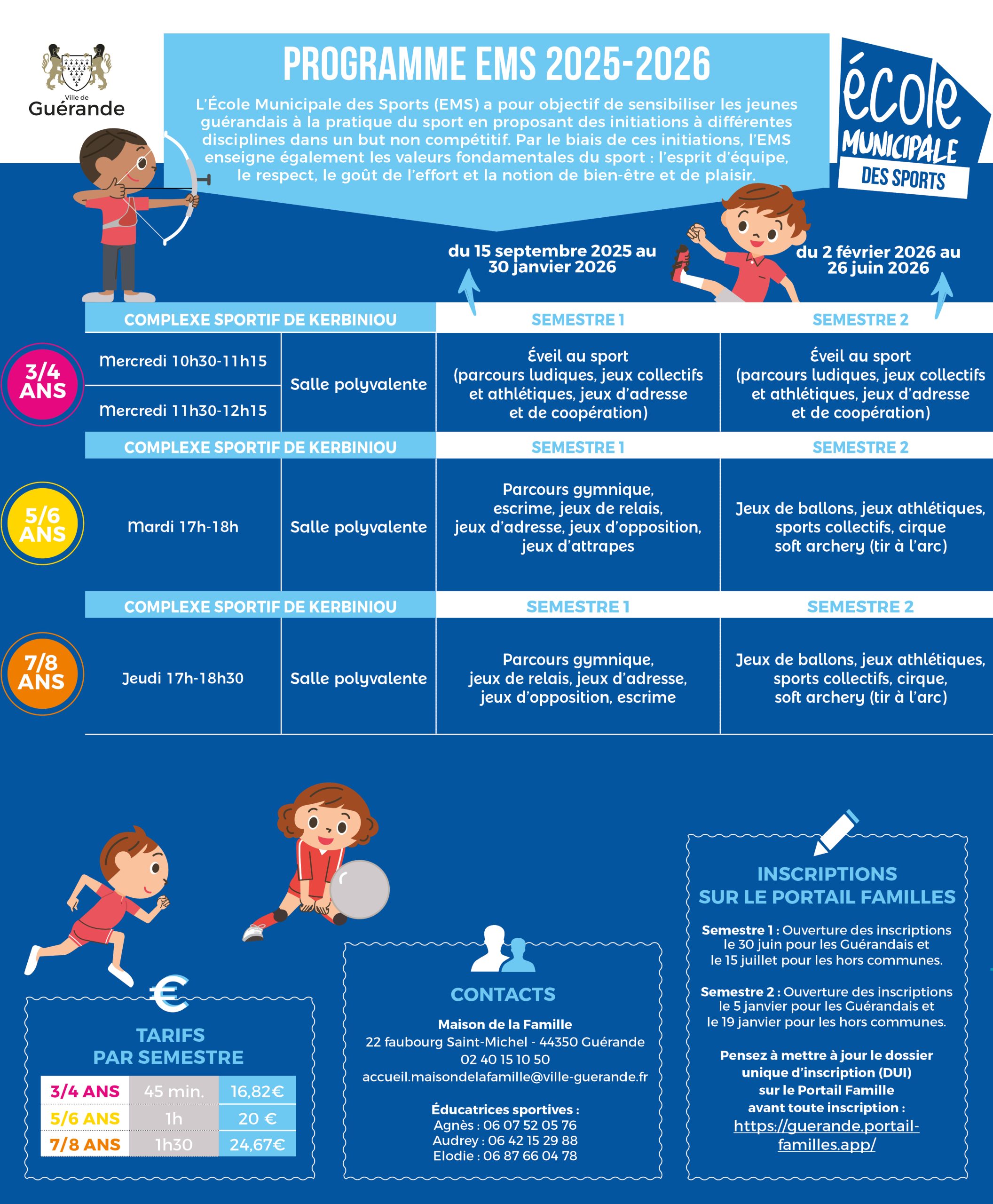 L’École Municipale des Sports (EMS) a pour objectif de sensibiliser les jeunes Guérandais à la pratique du sport en proposant des initiations à différentes disciplines dans un but non compétitif. La richesse du contenu et le choix des activités contribuent à une meilleure orientation sportive de l’enfant.